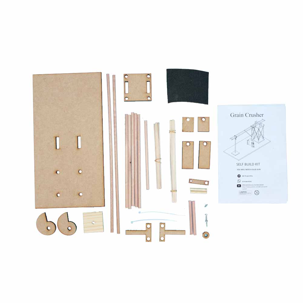 14 x 14cm coffee stirrers | 10 x 18cm coffee stirrers | 2 x 100mm cable ties | 5 x 200mm x 6mm Dowels | 1 x 145mm Dowel | Pine plank | 2 x Cam | 2 x T-bar | 2 x 30mm Pivot block | 2 x 60mm Pivot block